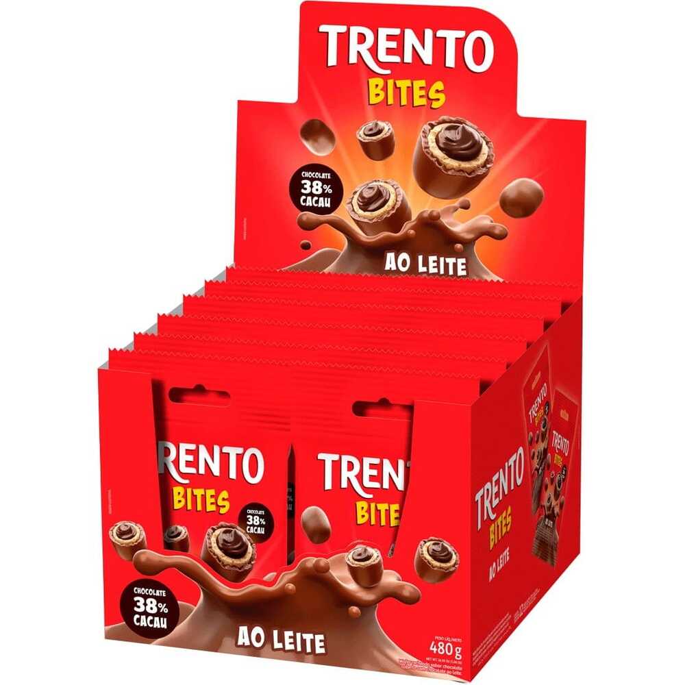 Trento Bites Ao Leite é um wafer recheado sabor chocolate coberto com chocolate ao leite 38% cacau, vendido em caixa com 12 unidades de 40g cada, proporcionando pequenas porções cheias de sabor.