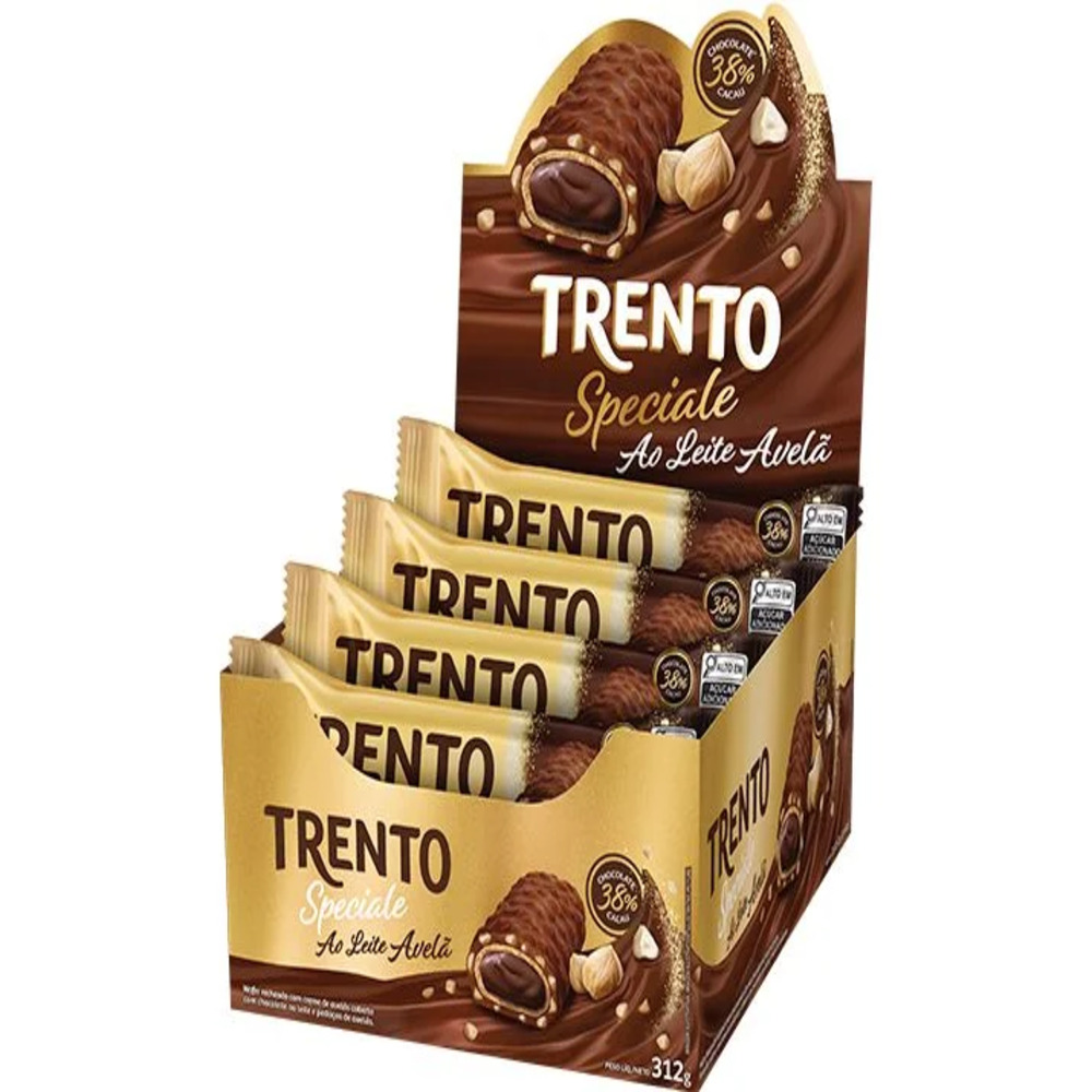 O Trento Speciale Avelã da Peccin é um wafer recheado com creme de avelã, coberto por chocolate ao leite e pedaços de avelã, apresentado em caixa com 12 unidades de 26 g cada, perfeito para saborear ou compartilhar.